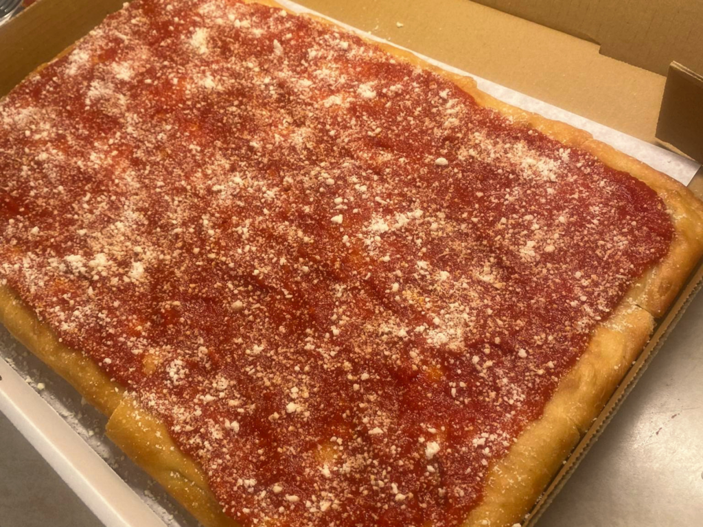 It’s not meant to be eaten hot like pizza — it’s served warm or at room temperature, letting the flavor of the sauce and the texture of the bread stand out.